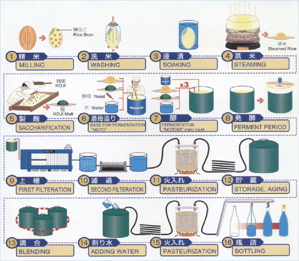 The microorganism Aspergillus oryzae is sprinkled onto the steamed rice and allowed to ferment for 5-7days (Uno et al., 2009). After this initial fermentation period, water and the yeast culture Saccharomyces cerevisiae are added to the koji (rice and mold mixture) and allowed to incubate at four degrees Celsius for about seven days (Uno et al., 2009). Over the next four days, pre-incubated mixture of steamed rice (90 kg), fermentated rice (90 kg) and water (440L) are added to the fermented mixture in three series (Uno et al., 2009).